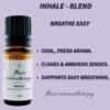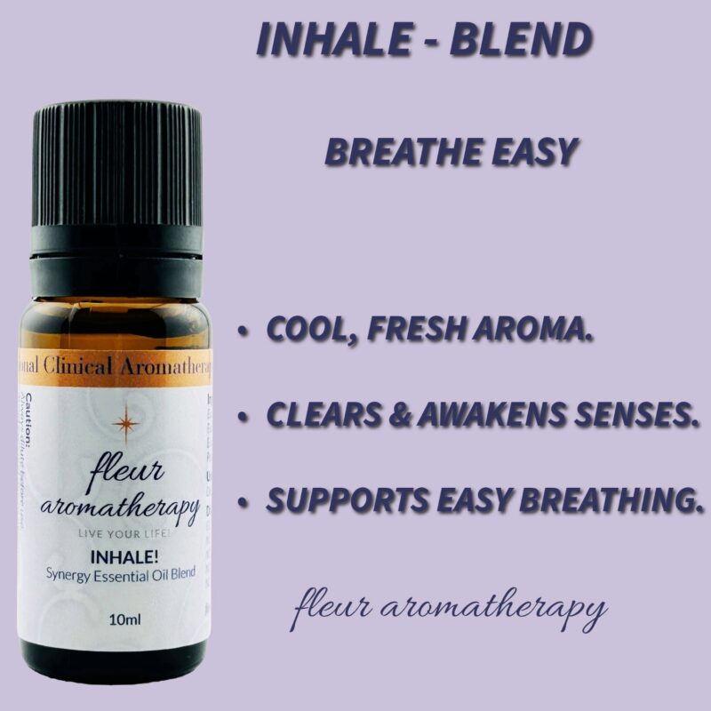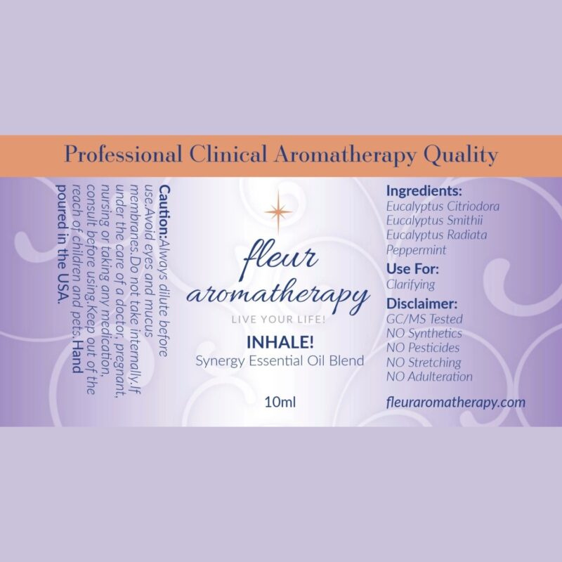 | Recommendations: | “Life is Breath! Breath is Life! Without breath there is no life! I personally love inhaling this blend before commencing my yoga breath work in the mornings! It is an absolute must for me! This simplistic synergistic blend of the 3 different Eucalyptus essential oils along with Peppermint essential oil is the perfect blend to ‘Inhale!’ This blend will aid in decongesting upper respiratory and sinus issues. It is perfect for shallow breathers who literally are depleting their bodies of oxygen by not inhaling properly. Use this blend in a 4% dilution (24 drops in 1oz of base oil) and rub into the upper chest area. It is also highly effective to place 2 drops in a bowl of hot water and place a towel over your head and inhale the steam for up to 30 seconds. Please remember to keep your eyes closed to avoid eye irritation. This blend is recommended for diffusing in a ‘fleur aromatherapy’ diffuser – INHALE!” Fleur Abajian RA (Registered Aromatherapist). |
