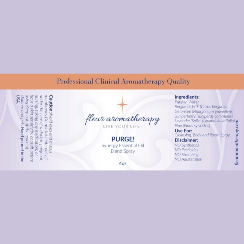 | Recommendations: | “Looking to purge and purify? This synergistic blend will aid in cleansing and clearing old and unwanted energy! This blend has antibacterial, antiseptic, antiviral, antimicrobial, fungicidal, deodorizing, and detoxifying qualities. It is great for purifying, detoxifying, enhancing immunity, and purging any unwanted energy you may encounter. This blend spray is diluted in purified water and can be sprayed directly on the skin (avoiding the eye area), around your home, office, car, or anywhere you want to purge energy. I personally like to spray myself with this to keep the ‘Energy Vampires’ at bay! – PURGE!” Fleur Abajian RA (Registered Aromatherapist). |