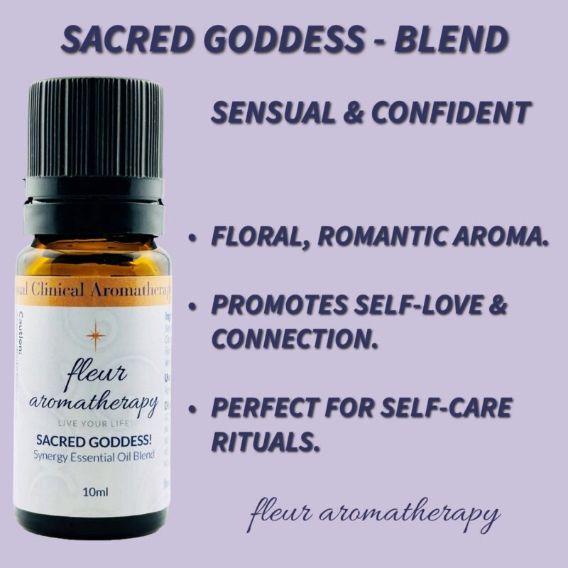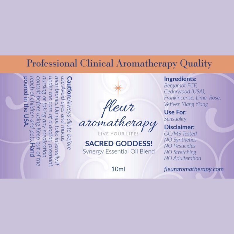 | Recommendations: | “This Sacred Goddess synergistic floral and citrus essential oil blend embraces the important feminine virtues and what it truly means to be a woman. Women are so sacred! This blend symbolizes beauty, love, sexuality, creativity, motherhood, and fertility. The calming, serene qualities of this blend will aid in de-stressing and balancing. Additionally, this blend is very sensual with the ultra-floral aphrodisiac vibes of Rose and Ylang Ylang. This blend may be used in a 2% dilution (24 drops in 2oz’s of base oil or unscented lotion) for a sensual massage or body moisturizer. Diffuse this feminine blend in a ‘fleur aromatherapy’ diffuser and embrace your SACRED GODDESS!” Fleur Abajian RA (Registered Aromatherapist). |