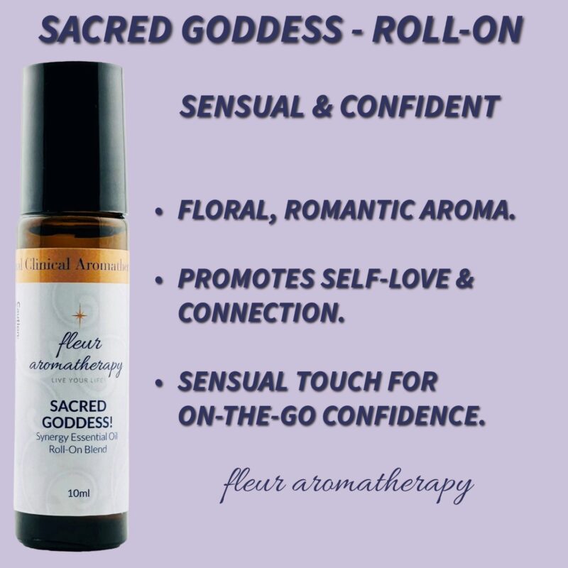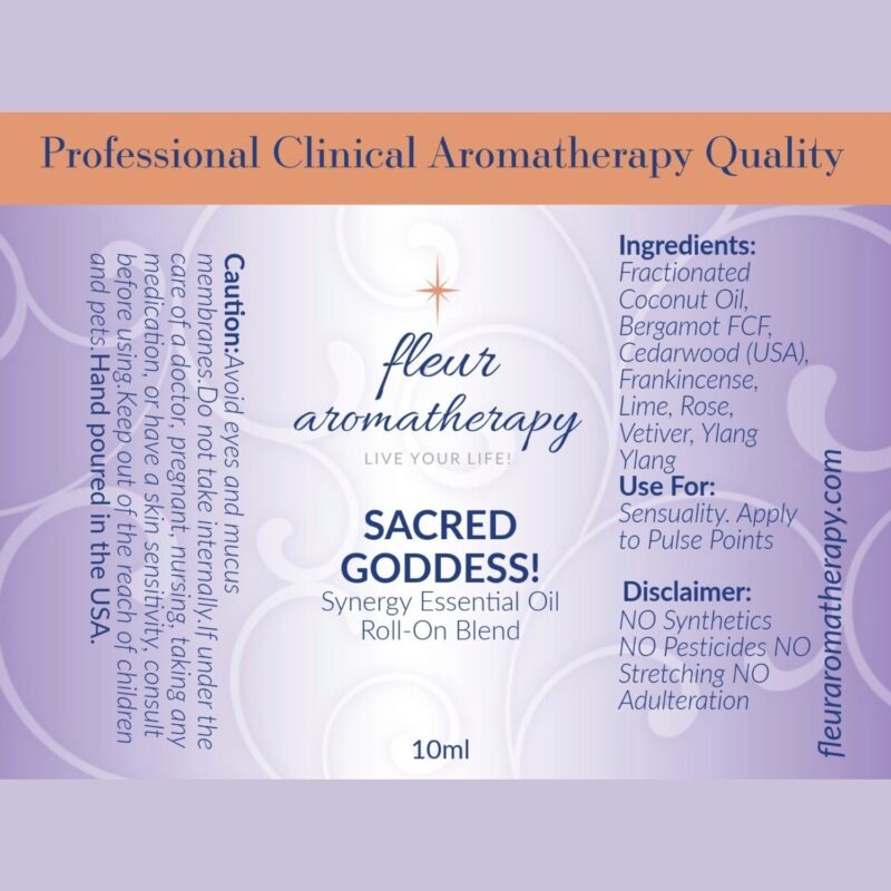 | Recommendations: | “This Sacred Goddess synergistic floral and citrus essential oil blend embraces the important feminine virtues and what it truly means to be a woman. Women are so sacred! This blend symbolizes beauty, love, sexuality, creativity, motherhood, and fertility. The calming, serene qualities of this blend will aid in de-stressing and balancing. Additionally, this blend is very sensual with the ultra-floral aphrodisiac vibes of Rose and Ylang Ylang. This roll-on blend is diluted in a 10% dilution in fractionated coconut oil and can be applied directly to the skin. Apply to the wrists, behind the ears, behind the knees, and the soles of the feet – embrace your SACRED GODDESS!” Fleur Abajian RA (Registered Aromatherapist). |