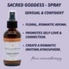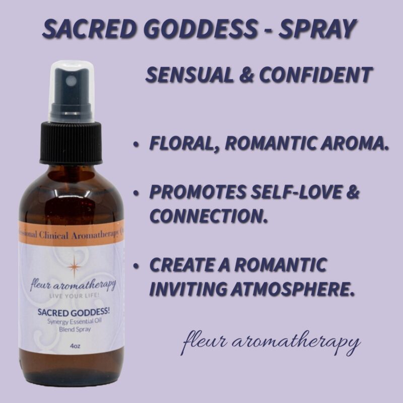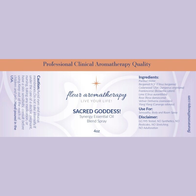 | Recommendations: | “This Sacred Goddess synergistic floral and citrus essential oil blend embraces the important feminine virtues and what it truly means to be a woman. Women are so sacred! This blend symbolizes beauty, love, sexuality, creativity, motherhood, and fertility. The calming, serene qualities of this blend will aid in de-stressing and balancing. Additionally, this blend is very sensual with the ultra-floral aphrodisiac vibes of Rose and Ylang Ylang. This blend spray is diluted in purified water and can be sprayed directly on the skin (avoiding the eye area), around your home, office, and car – embrace your SACRED GODDESS!” Fleur Abajian RA (Registered Aromatherapist). |